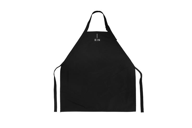 Cikkszám: 0832-klo-310325Professzionális gyártású, Fekete, erős, lemosható, vízálló, poliészterből készült kötény, 70x75 cm-es méretben, 2db nagy zsebbel, KIN Cosmetics logóval.