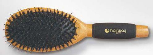 Cikkszám: 1827-08177-75×240mmVaddisznósörte - Fodrászkellék - Fa Hajkefe. - Fából készült, luxus kivitelű bontó, wellness hajkefe, pneumatikus csillapító párnával, ergonómikus kialakítású nyéllel. A hajkefe fejbőrt is masszírozó, tüskéi antisztatikus műanyagból készültek. A hajkefe hossza kb.240mm, fej szélessége kb. 75mm